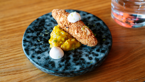 Der Hauptgang war mein persönlicher Favorit: eine aromatische Fischbrühe, garniert mit Kimchi-Frischkäse und einem perfekt gegarten Stück Fisch. Das Gericht wurde mit selbstgebackenem Brot und Butter serviert, und wir übertreiben nicht, wenn wir sagen, dass es eines der besten Brote war, die wir je probiert haben. Es wird täglich mit einer über 150 Jahre alten Hefekultur hergestellt!