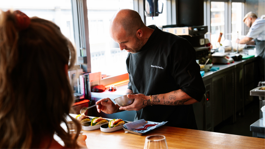 Vom Markt aus gingen wir um die Ecke zum Three House, einem stilvollen Hotel, Bar und Restaurant. Im dritten Stock befindet sich das Restaurant Three House, wo wir ein unglaubliches Show-Cooking-Erlebnis in Funchal mit dem lokalen Chefkoch Mauricio Faria hatten.