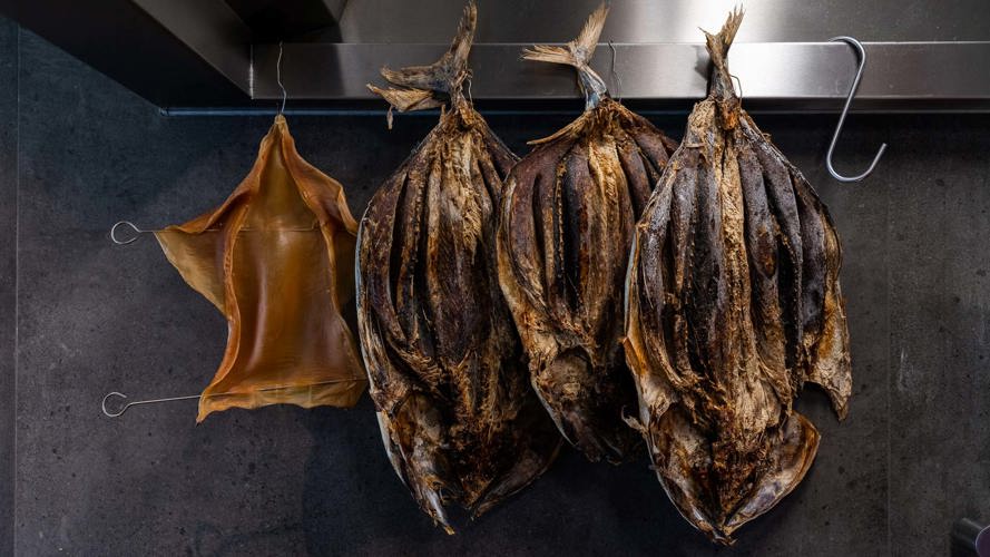 Das Team lud uns sodann zu einer kurzen Tour durch die Küche ein - ein seltener und spannender Blick hinter die Kulissen, auf den man offensichtlich sehr stolz ist. Trocken gereifter und geräucherter Fisch hängt an den Wänden, saisonale Früchte sind für die Desserts des Abends arrangiert, doch es ist der größte Ofen, den ich je gesehen habe - per Kran installiert - welcher im offenen Küchenbereich den zentralen Platz einnimmt. Wir konnten sehen, wie die Köche mit Präzision und Leidenschaft arbeiteten, und es verlieh uns ein tieferes Verständnis dafür, was uns noch erwartete.