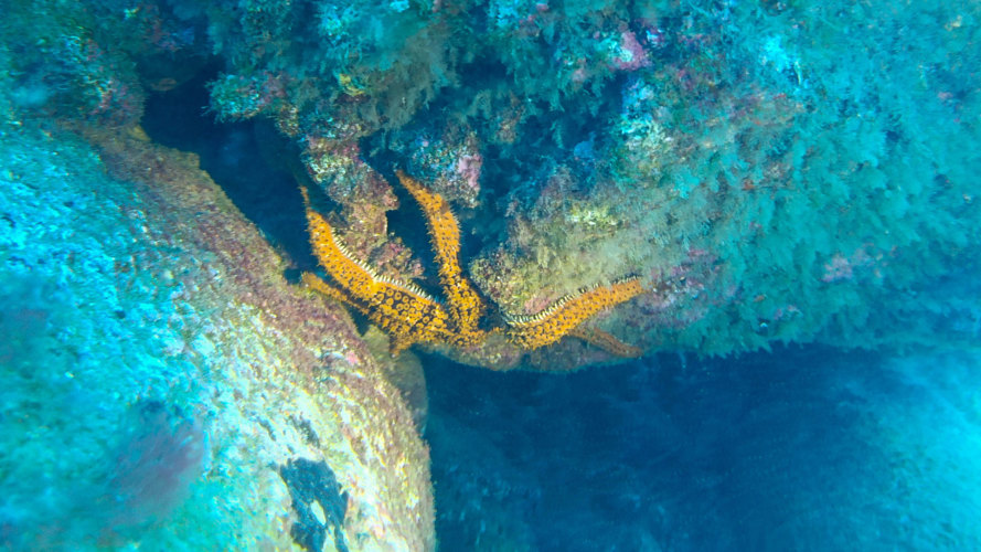 Das Briefing war sehr einfach und klar, und das Team vom Cipreia Dive Club war unglaublich geduldig mit mir. Susana hat mir empfohlen, eine Haube zu tragen, weil das Wasser kalt war, aber ich dachte, das wäre nicht nötig - ich war ja am Tag zuvor schon im Wasser und fand es völlig in Ordnung. Als wir alle vom Boot sprangen, merkte ich sofort. dass ich einen Fahler begangen hatte: Ja, hier war das Wasser deutlich kälter als am Strand! Aber trotzdem war die Begeisterung, im Wasser zu sein, größer als die Kälte, also war es gut auszuhalten!