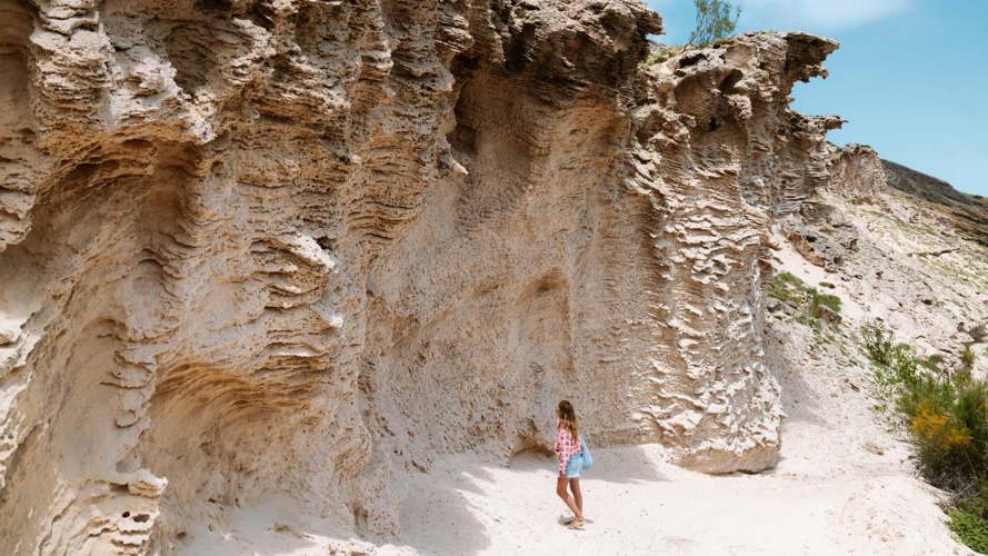 Um pouco mais à frente do Porto dos Frades existe um acesso absolutamente impressionante à praia. Continuem pelo mesmo trilho arenoso ao longo das falésias até à Fenda da Dona Beja, um desfiladeiro estreito entre formações de areia. Subam uma pequena escada de madeira até à abertura.