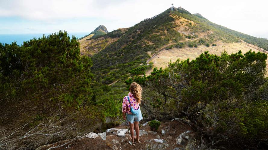 O nosso objetivo para esse dia era o Pico do Castelo – o pico de origem vulcânica que se avista de praticamente toda a ilha. O miradouro no topo proporciona vistas panorâmicas sobre a montanha e o oceano, sendo o ponto alto da caminhada pelo trilho PRPS2.