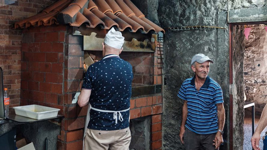Wir überquerten die Straße, um den örtlichen Metzger zu besuchen, dessen Betrieb sich unter seinem Laden befindet. Ein Espetada-Restaurant, in dem sich Einheimische treffen und ihre eigene Espetada am offenen Grill zubereiten. Ein beeindruckendes Schauspiel.
