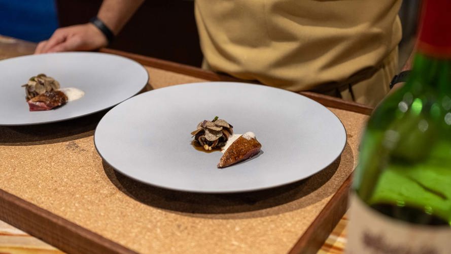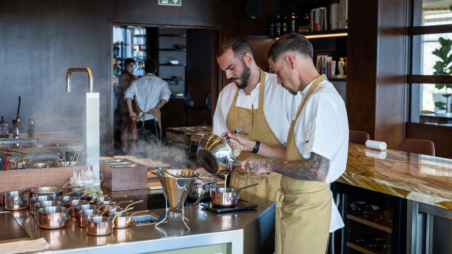 Das Team lud uns sodann zu einer kurzen Tour durch die Küche ein - ein seltener und spannender Blick hinter die Kulissen, auf den man offensichtlich sehr stolz ist. Trocken gereifter und geräucherter Fisch hängt an den Wänden, saisonale Früchte sind für die Desserts des Abends arrangiert, doch es ist der größte Ofen, den ich je gesehen habe - per Kran installiert - welcher im offenen Küchenbereich den zentralen Platz einnimmt. Wir konnten sehen, wie die Köche mit Präzision und Leidenschaft arbeiteten, und es verlieh uns ein tieferes Verständnis dafür, was uns noch erwartete.
