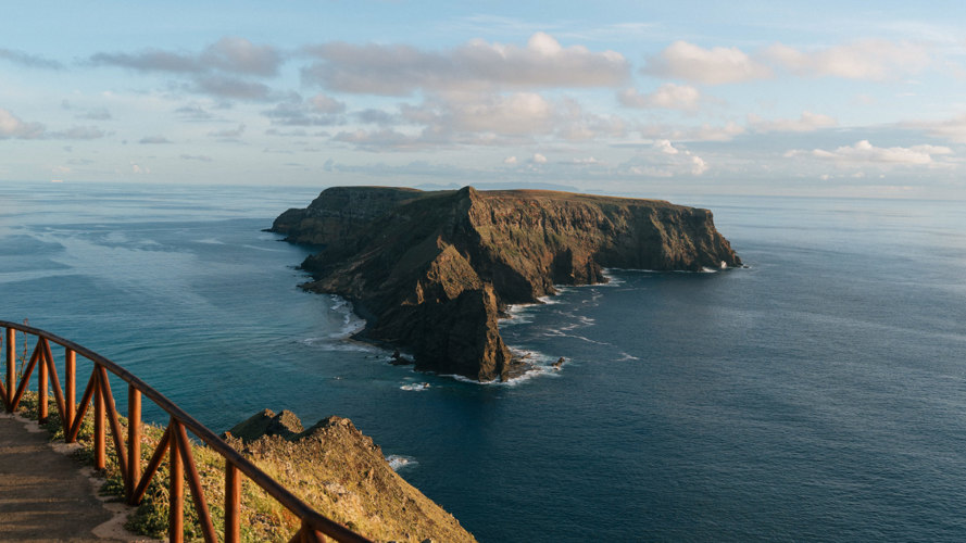 Mein Highlight? Der Aussichtspunkt Miradouro das Flores! Was für ein außergewöhnlicher Ort, besonders zum Sonnenuntergang, mit Blick auf den Ilhéu do Cal und Madeira am Horizont. Als wir ankamen, stand die Sonne schon kurz vor dem Untergang und der Himmel färbte sich in zarte Rosa- und Goldtöne. Der Kontrast zwischen dem felsigen Ilhéu, dem Meer und dem warmen Abendlicht war einfach magisch.
