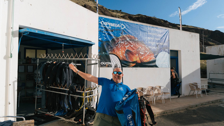 Das Briefing war sehr einfach und klar, und das Team vom Cipreia Dive Club war unglaublich geduldig mit mir. Susana hat mir empfohlen, eine Haube zu tragen, weil das Wasser kalt war, aber ich dachte, das wäre nicht nötig - ich war ja am Tag zuvor schon im Wasser und fand es völlig in Ordnung. Als wir alle vom Boot sprangen, merkte ich sofort. dass ich einen Fahler begangen hatte: Ja, hier war das Wasser deutlich kälter als am Strand! Aber trotzdem war die Begeisterung, im Wasser zu sein, größer als die Kälte, also war es gut auszuhalten!
