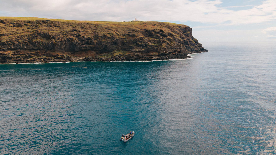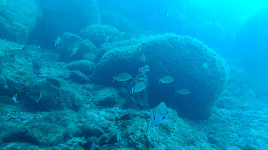 So machten wir uns auf den Weg zum heutigen Tauchplatz: Cabeço do Poio. Lasst euch nicht vom ungewöhnlichen Namen täuschen - der Ort ist wunderschön und gehört zu den bekanntesten Tauchplätze auf Madeira. Er liegt in der Nähe der Ilhéu de Cima, genau wie viele andere Tauchplätze in Porto Santo. Es war wunderschön, die Veränderung des Blautons des Wassers zu sehen, seit wir den Hafen verlassen hatten - bis zur Ilhéu, die tatsächlich „ganz nah“ war, nur etwa 10 Minuten Bootsfahrt entfernt. Cabeço do Poio ist perfekt für Taucher wie mich, die nicht so viel Erfahrung haben. Es ist ein relativ leichter Tauchplatz mit felsigen Blöcken, die von Leben bedeckt sind und eine fast mondähnliche Landschaft bilden. Die Tiefen variieren zwischen 15 und 28 Metern. Obwohl es in dieser Gegend etwas Wellengang gab, war die Sicht an diesem Tag einfach surreal - über 30 Meter kristallklares Blau erwarteten uns.