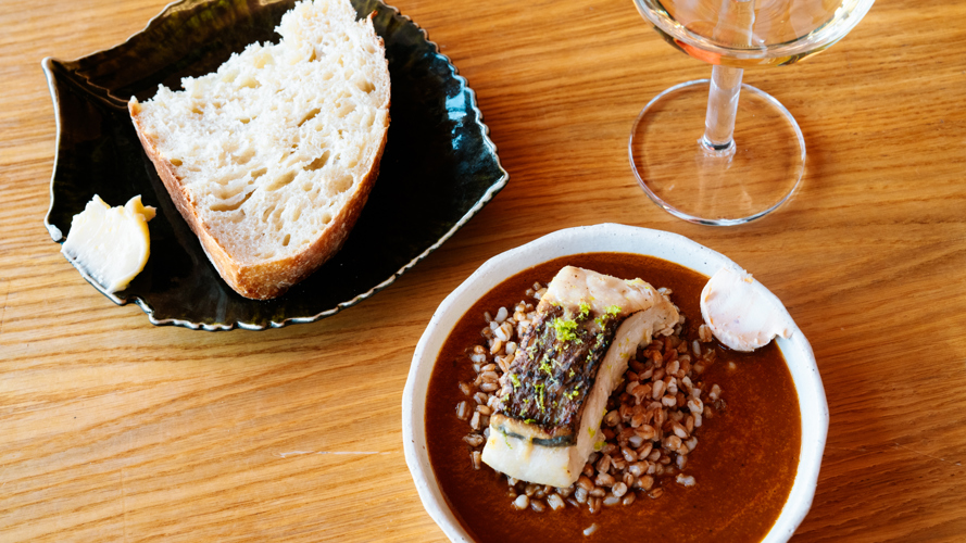 Le plat principal a été mon préféré : un bouillon de poisson savoureux, surmonté d’une crème au fromage et kimchi, accompagné d’un morceau de poisson parfaitement cuit. Le plat était accompagné de pain et de beurre faits maison, et nous n’exagérons pas en disant que c’était l’un des meilleurs pains que nous ayons jamais goûtés. Il est préparé chaque jour à partir d’une levure vieille de plus de 150 ans !