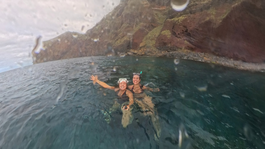 A meio, parámos para fazer snorkeling na Reserva Parcial do Garajau, onde ficámos rodeadas por peixes de todas as cores. Estar ali a boiar, a olhar para as falésias a partir do mar, fez-me perceber o quão selvagem e intacta esta ilha ainda é.
